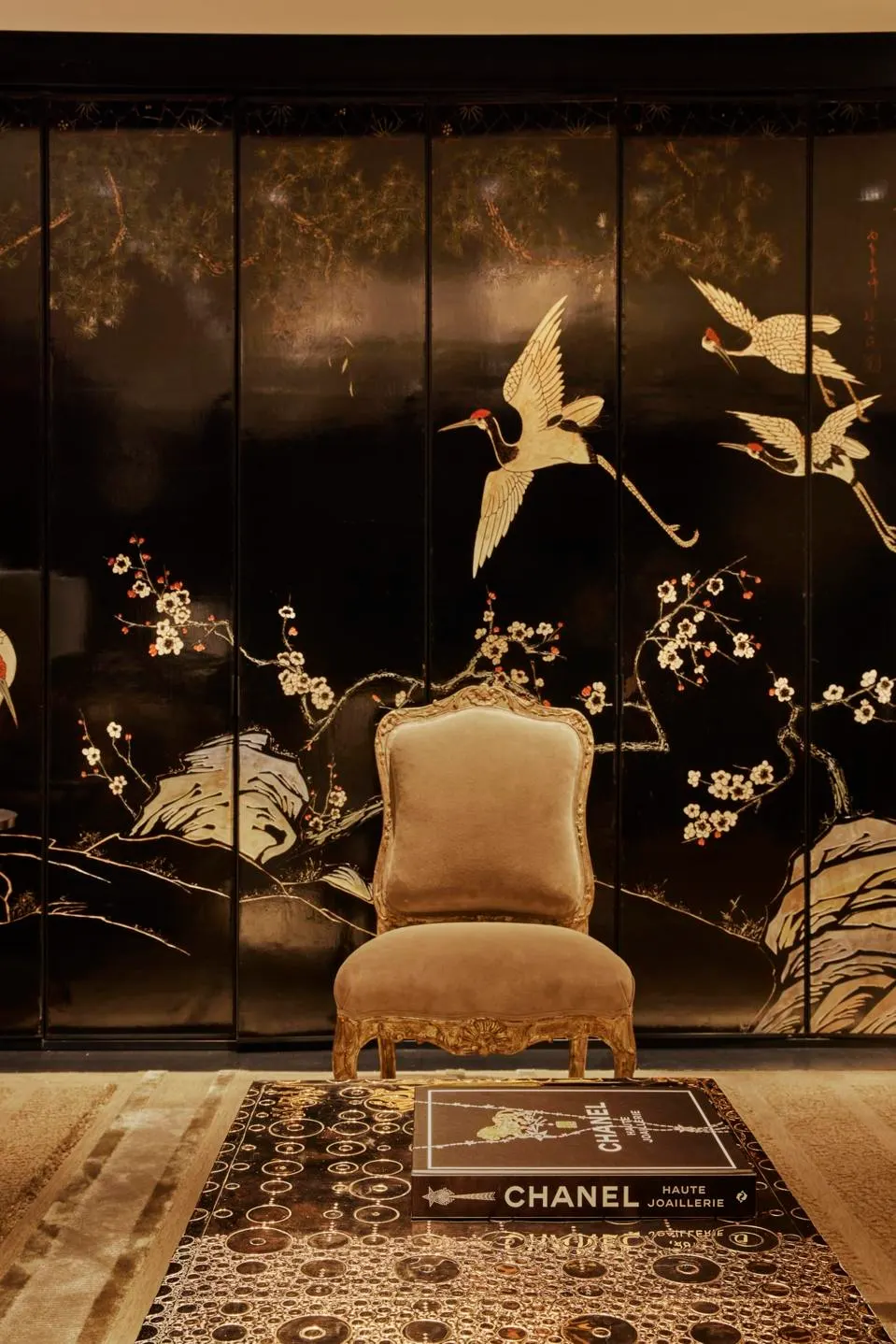 Divided into two parts, on the first floor are two fine jewellery showrooms with double-height ceilings, as well as a watch salon featuring a 13-panel gold leaf on linen canvas wall collage custom-made for Chanel by Iranian American painter Y.Z. Kami. The second floor houses two more fine jewellery salons, one of which is reserved for private clients, as well as a black-painted wood wall piece by American sculptor Louise Nevelson, and a tempera, metal, and wood panel by Norwegian abstract expressionist painter Anna-Eva Bergman.